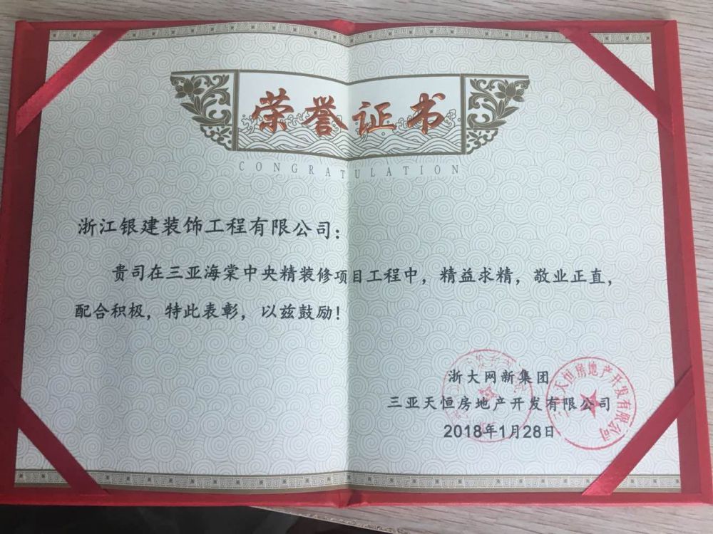 2018年新年伊始,我司海棠中央項目部收到浙大網(wǎng)新集團(tuán)頒發(fā)的新年賀章!“精益求精、敬業(yè)正直”配合積極是業(yè)主單位對項目部的高度評價。