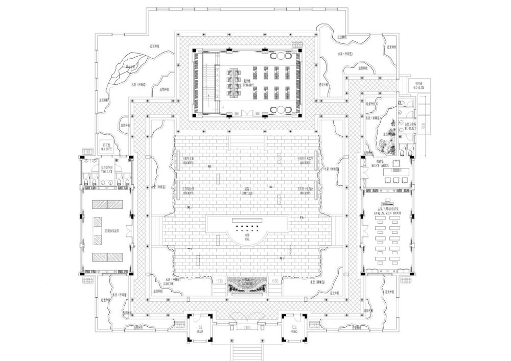 整個項(xiàng)目由典型的中式合院結(jié)構(gòu)圍合而成:由三幢主要的仿古建筑、加上接待室、值班室、圍廊等建筑物構(gòu)成,另設(shè)有牌樓、雕塑等外圍景觀小品,建筑物占地面積1480平米,建筑面積約750平米。接到案子后,設(shè)計(jì)小組經(jīng)過反復(fù)討論,對原建筑設(shè)計(jì)做了局部調(diào)整優(yōu)化:左廂房(陽明陳列館)的門窗做了局部調(diào)整,藏書樓的樓梯移位、門窗;琴房的公衛(wèi)位置等進(jìn)行了平面調(diào)整;室外景觀方面,由于考慮人流可能會較多,原中庭院的四個水景取消改為青石滿鋪,加地埋燈,增加泰山石造型及中間涌泉造型景觀;在入口增加玄關(guān)墻,把中式庭院景觀對于“隱與透”在書院的入口做一些“猶抱琵琶半遮面”的細(xì)部處理。