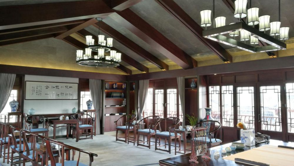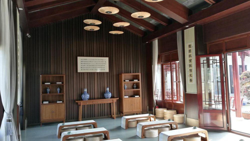 陽明國學(xué)講堂:頂棚面黑檀木人字形木梁,3mm超薄青石飾面,蒲葉吊燈,墻面皺褶的書籍造型金屬飾面,青石鋪地,加上簡約的琴幾、厚厚的白柳編蒲團(tuán)構(gòu)成的,沒有過多的雕飾,構(gòu)成書院講堂的濃濃文化氛圍。