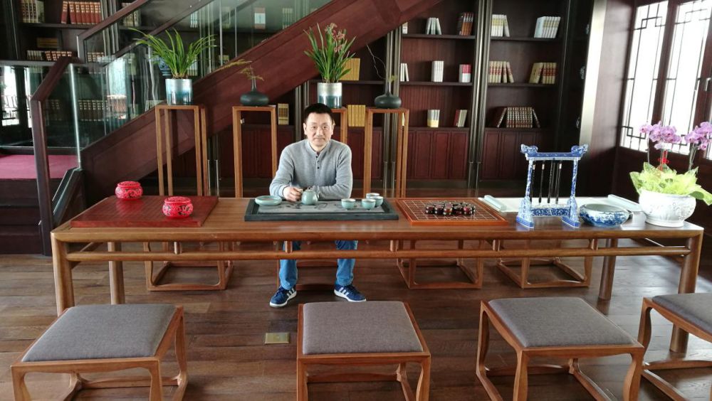 藏書樓接待區(qū):配設(shè)明式圈椅,黛青色山水紋羊毛毯儀式感莊重、氛圍典雅。