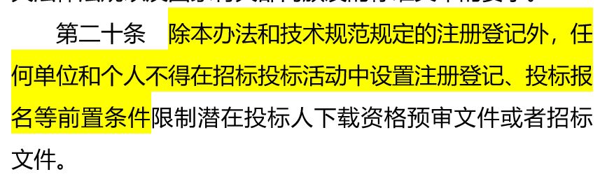 早在之前國(guó)家發(fā)改委和住建部等八部委公布第20號(hào)令《電子招標(biāo)投標(biāo)辦法》中也明確規(guī)定:除本辦法和技術(shù)規(guī)范規(guī)定的注冊(cè)登記外,任何單位和個(gè)人不得在招標(biāo)投標(biāo)活動(dòng)中設(shè)置注冊(cè)登記、投標(biāo)報(bào)名等前置條件限制潛在投標(biāo)人下載資格預(yù)審文件或者招標(biāo)文件。