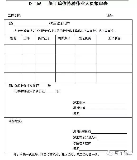 有特殊作業(yè)人員,需向項目部上報其工程相應(yīng)的合格有效的特殊工程作業(yè)人員操作證復(fù)印件(如:電工、電氣焊工、架子工、起重司索工、起重司機、起重機械安拆工、吊籃安拆工、場內(nèi)機動車駕駛員、樁工等)。