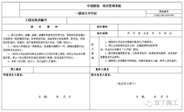 1)在非固定的,無明顯危險因素的場所進行動火作業(yè)等均屬三級動火。 2)三級動火申請人應(yīng)在三天前提出,批準(zhǔn)最長期限為七天,期滿后應(yīng)重新辦證,否則視作無證動火。 3)三級動火作業(yè)由所在班組填寫,經(jīng)本單位項目部施工負責(zé)人審查批準(zhǔn),方可動火。 |